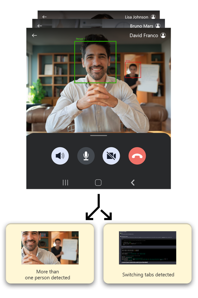 The system uses a combination of webcam, screen, and audio analysis to identify unusual patterns such as multiple faces, gaze aversion, tab switching, or background noise. Each event is time-stamped, flagged, and summarized in an instructor dashboard for review.